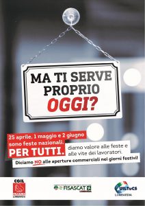 “Anche quest’anno migliaia di lavoratrici e lavoratori del commercio non potranno passare le feste con i propri cari, perché moltissime attività commerciali resteranno aperte per le prossime festività: 25 aprile, 1 maggio e 2 giugno.