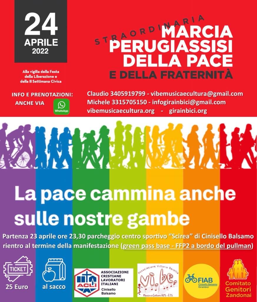 Con lo slogan “La pace cammina anche sulle nostre gambe”, ACLI, VI.BE, FIAB, Comitato Genitori Zandonai di Cinisello Balsamo organizzano un pullman che partirà alle 23.30 di sabato 23 aprile dal parcheggio del Centro Sportivo Gaetano Scirea – via Cilea 50 per partecipare alla manifestazione straordinaria della Marcia PerugiAssisi della Pace .(http://www.vibemusicaecultura.org/).
