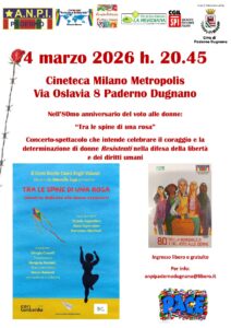 – nell’ambito delle iniziative per l’80mo del voto alle donne, stiamo organizzando per il mese di marzo 2026 uno spettacolo teatrale che intende celebrare il coraggio e la determinazione di donne Resistenti nella difesa della libertà e dei diritti umani. Lo spettacolo si terrà al Cinema Metropolis il 4/3/2026 h. 20.45 e a breve la locandina da diffondere