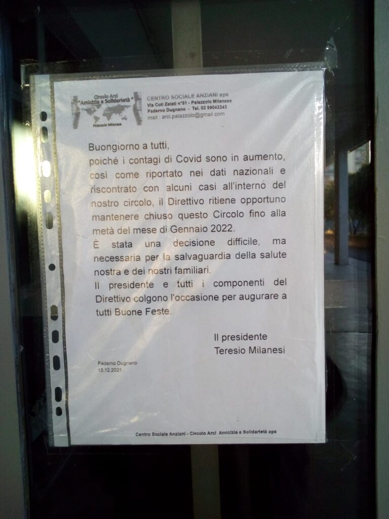 Il Centro Anziani di Palazzolo chiuso per Covid