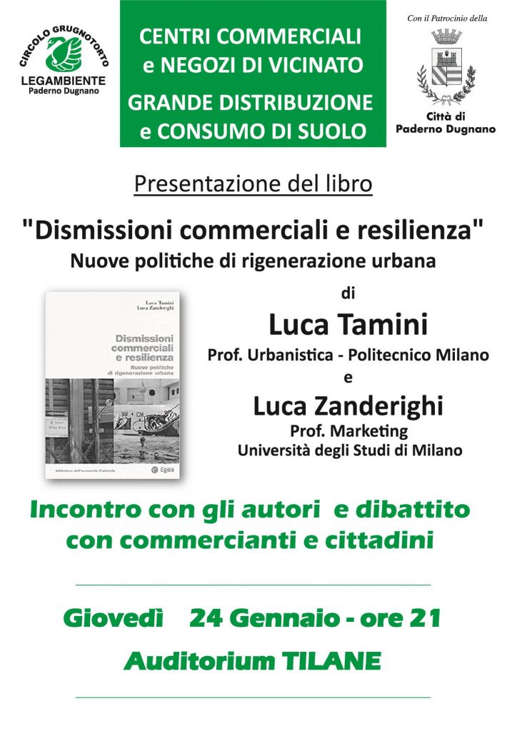 Dopo la decisione della Giunta comunale di “sospendere”, fino a dopo le elezioni amministrative del 2019, Legambiente promuove una serata di presentazione del libro di Luca Tamini e Luca Zanderighi dal titolo “Dismissioni commerciali e resilienza”.