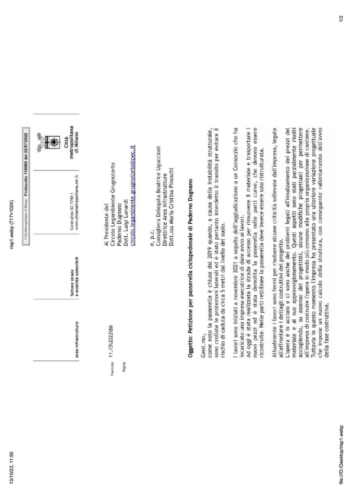 “Nello scorso mese di luglio, sono state inviate a Città Metropolitana le firme di 895 cittadini che, con una petizione, hanno chiesto la ripresa dei lavori necessari alla riapertura della passerella ciclopedonale di scavalco della ferrovia a Palazzolo, oltre ai due ponti ciclopedonali di attraversamento del canale Villoresi.