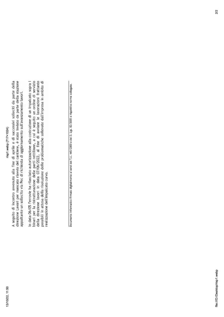 Siamo consapevoli del grave disagio che il protrarsi dell’interruzione della passerella comporta per tutti i fruitori del percorso ciclopedonale e ci scusiamo per i ritardi dovuti all’inadempienza dell’impresa esecutrice, ribadendo il nostro impegno per riconsegnare alla cittadinanza una infrastruttura attesa da anni.”