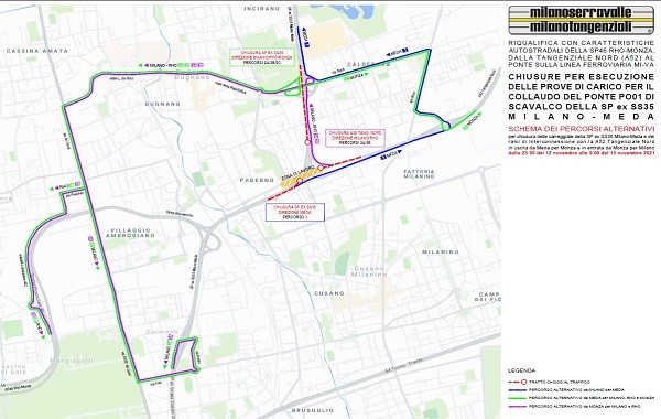 “La chiusura si rende necessaria per consentire le prove di carico funzionali al collaudo del ponte di scavalco della SP ex SS35 “dei Giovi” – opera di collegamento diretto della A52 Tangenziale Nord con il suo prolungamento costituito dalla SP 46 “Rho-Monza” in corso di riqualificazione – la cui apertura al traffico, a conclusione dell’iter di collaudo, è prevista indicativamente entro il prossimo 31-12-2021.”