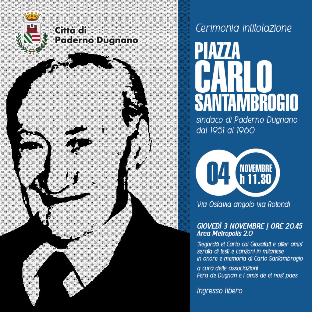 Il 3 novembre alle ore 20.45 all’ Area Metropolis 2.0 di via Oslavia 8 ci sarà una serata teatrale intitolata ” Regordà el Carlo col Giosafatt e alter amis”, con testi e canzoni in milanese in onore e memoria di Carlo Santambrogio: sindaco di Paderno Dugnano dal 1951 al 1960.